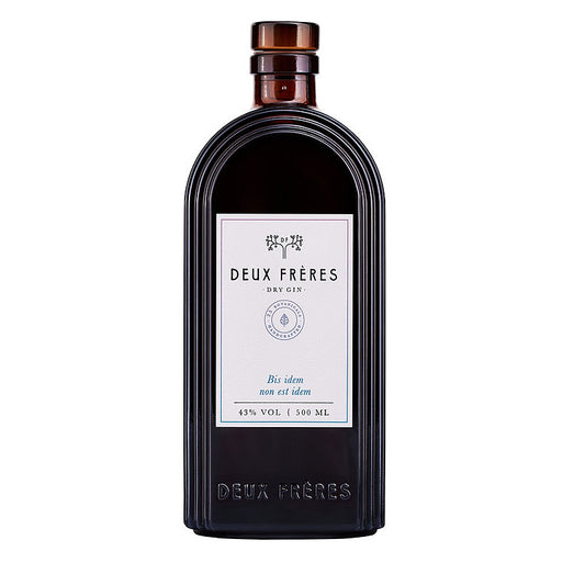 Il ne faut pas confondre Deux Frères et Deux Frangins. Les premiers élaborent et distillent. Les seconds dégustent et distribuent. Mon tout offre à vos papilles, un alcool haut de gamme, un dry gin d’exception. A consommer pur, en gin tonic ou en cocktail.